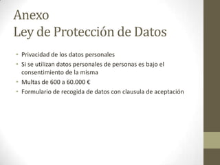 Este documento contiene información sobre comunicación en Internet, incluyendo la privacidad de datos personales, diferentes tipos de páginas web, redes sociales, ejercicios de búsqueda en Google y búsquedas en Google Maps. Se discuten temas como la ley de protección de datos, páginas web informativas, corporativas y de redes sociales, y ejemplos de búsquedas de contactos, empresas, direcciones y servicios.