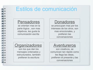 Este documento resume diferentes estilos de comunicación, como organizadores, donadores, aventureros y pensadores. También discute cómo recibir críticas de manera constructiva, la importancia del lenguaje corporal en la comunicación, y consejos para manejar conflictos de manera asertiva como escuchar activamente, no atacar, y mantener la calma.