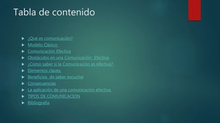 Este documento trata sobre la comunicación efectiva. Define la comunicación como el proceso de transmitir información de un punto a otro. Explica el modelo clásico de comunicación, que incluye un comunicador, codificación del mensaje, transmisión del mensaje a través de un medio, decodificación por el receptor, y retroalimentación. También describe los obstáculos a una comunicación efectiva y cómo saber si la comunicación es efectiva, e incluye diferentes tipos de comunicación.