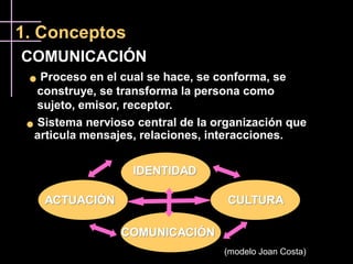 El documento presenta conceptos clave sobre comunicación empresarial, incluyendo identidad corporativa, imagen corporativa y comunicación interna y externa. Explica que la comunicación es un proceso central para las organizaciones y que involucra a todos los niveles de la empresa. También destaca la importancia de definir estrategias de comunicación y contar con profesionales capacitados para gestionarla de manera efectiva.