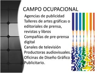 Este documento describe los campos de trabajo y objetivos de la carrera de diseño gráfico. Los campos incluyen agencias de publicidad, talleres de artes gráficas, canales de televisión, oficinas de diseño gráfico y más. Los objetivos son informar e ideas a través de un lenguaje visual y dar soluciones óptimas a problemas de comunicación gráfica. El perfil profesional involucra habilidades en creación de imágenes, expresión gráfica y tecnologías computacionales.