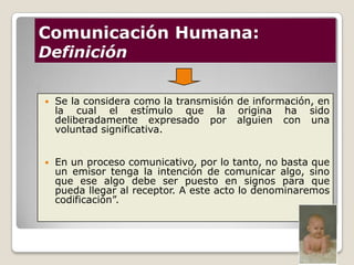 El documento trata sobre la comunicación humana. Define la comunicación como un proceso que implica un emisor, mensaje, código, canal y receptor. Explica que la comunicación tiene funciones expresivas, informativas, utilitarias y persuasivas. Además, distingue entre comunicación verbal y no verbal, y señala que esta última representa entre un 65-80% de la comunicación total.