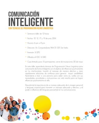 Este documento describe un taller de comunicación inteligente de 12 horas que se llevará a cabo entre el 10 y 19 de junio de 2014 en Lima, Perú. El taller enseñará técnicas de Programación Neuro Lingüística para mejorar la comunicación, influencia y creación de confianza. Los facilitadores son expertos en el tema con experiencia en entrenamiento y consultoría.