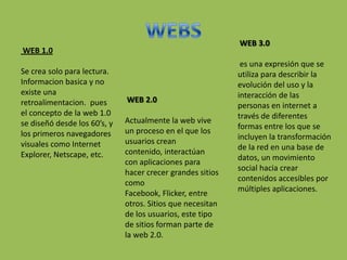 El documento describe la evolución de la web y las tecnologías de comunicación. Explica que la Web 1.0 solo permitía la lectura de información básica, mientras que la Web 2.0 permite a los usuarios crear y compartir contenido de forma interactiva en sitios como Facebook y Flickr. La Web 3.0 se refiere a la transformación de la red en una base de datos interconectada que permite el acceso a contenido desde múltiples aplicaciones.