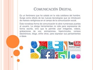 El documento describe los conceptos clave relacionados con la comunicación digital y la web. Explica la evolución de la web 1.0 a la web 3.0, con la web 1.0 centrada en la lectura, la web 2.0 permitiendo la interacción de los usuarios, y la web 3.0 impulsada por la inteligencia artificial. También define términos como hipervínculo, sitio web, página web, multimedia, redes sociales, blogs y más.