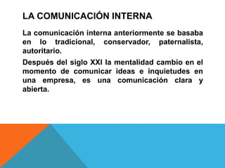 Este documento describe los diferentes tipos de comunicación interna en una empresa. Explica que la comunicación interna ya no es solo tradicional y autoritaria, sino que debe ser clara, abierta y fluida para ayudar a las empresas a lograr sus objetivos estratégicos de manera rentable. También define la comunicación formal e informal, así como la comunicación descendente, ascendente y horizontal, y explica la importancia de gestionar bien la comunicación interna para reducir conflictos y lograr una mejor productividad.