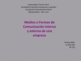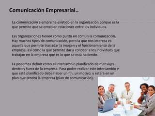 Este documento resume los diferentes tipos de comunicación interna y externa que una empresa debe tener. Explica que la comunicación interna incluye comunicarse con el personal, la dirección, representantes laborales y empresas filiales, mientras que la comunicación externa incluye comunicarse con el mercado, colaboradores y el entorno social. También destaca que a pesar de la importancia de la comunicación, muchas empresas no reconocen adecuadamente al director de comunicación ni planifican estratégicamente su comunicación.