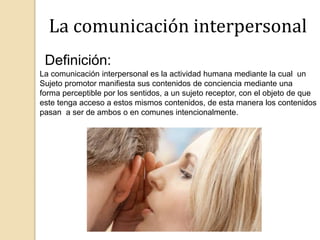 Este documento habla sobre la comunicación interpersonal. Define la comunicación interpersonal como la actividad mediante la cual un sujeto transmite sus contenidos de conciencia a otro sujeto para que tenga acceso a esos mismos contenidos. Explica que la comunicación interpersonal es la forma más importante de comunicación para los seres humanos y que incluye elementos verbales y no verbales. También describe brevemente algunas barreras comunes a la comunicación como factores ambientales, verbales e interpersonales.
