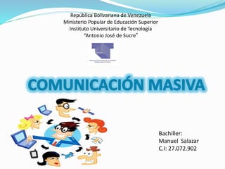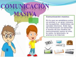 El documento define la comunicación de masas como la interacción entre un emisor único y una audiencia numerosa, heterogénea y anónima. Explica que los medios de comunicación masiva son aquellos que transmiten mensajes a grandes audiencias sobre grandes distancias rápidamente, y describe algunos ejemplos como la televisión, radio, prensa e internet. También destaca que estos medios juegan un papel importante en la formación de opinión pública debido a su capacidad de llegar rápidamente a millones de personas.