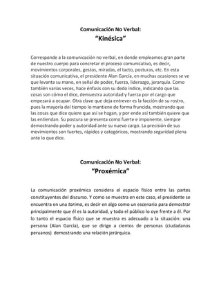 El documento analiza la comunicación no verbal del presidente electo de Perú Alan García en un discurso de agradecimiento a través de tres perspectivas: kinésica (movimientos corporales que muestran poder y autoridad), proxémica (se ubica en una tarima separado del público mostrando jerarquía) y paralingüística (habla con tono seguro y fluidez sin nerviosismo mostrando tranquilidad).