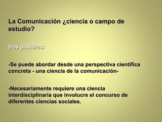 El documento discute dos posturas sobre si la comunicación es una ciencia o un campo de estudio interdisciplinario. Por un lado, los enfoques positivistas defienden una ciencia de la comunicación mientras que los enfoques críticos argumentan que requiere un abordaje interdisciplinario debido a su amplitud y complejidad. Además, explica las diferencias entre estas perspectivas en términos de teorías, autores y técnicas de investigación.