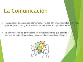 La comunicación es un proceso sistémico de interacción entre dos o más personas mediante un código común. Existen diferentes formas de comunicación como la oral, que utiliza la voz, y la no verbal, que incluye gestos, expresiones faciales y postura corporal. Aunque a menudo se confunden, la expresión solo manifiesta sentimientos mientras que la comunicación requiere de un emisor, mensaje y receptor.