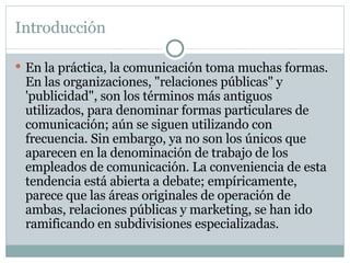 La comunicación corporativa incluye tres formas importantes: 1) la comunicación de dirección, que es esencial para lograr la cooperación dentro de la organización; 2) la comunicación de marketing, cuyo elemento dominante es la publicidad; y 3) la comunicación organizativa, que incluye relaciones públicas y se dirige a los públicos clave con los que la organización interactúa.