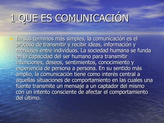 El documento describe las diferentes formas de comunicación en las organizaciones. Explica que la comunicación es el proceso de transmitir e intercambiar ideas entre individuos. Luego describe las tres formas principales de comunicación: descendente, ascendente y horizontal. La comunicación descendente transmite información de los superiores a los subordinados, la comunicación ascendente permite la retroalimentación de los subordinados a los superiores, y la comunicación horizontal ocurre entre personas del mismo nivel jerárquico. Finalmente, el documento menciona diferentes medios de comunicación formal e informal dentro de las organiz