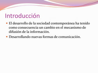 El documento describe la comunicación colectiva y los medios de comunicación. Explica que el desarrollo de la sociedad ha cambiado los mecanismos de difusión de información, desarrollando nuevas formas de comunicación debido a factores como la concentración urbana y el abandono rural. La comunicación colectiva se caracteriza por involucrar a grupos que reciben mensajes homogéneos de forma ocasional o permanente a través de medios controlados por instituciones. Los medios de comunicación amplifican y expanden los mensajes pero su uso de