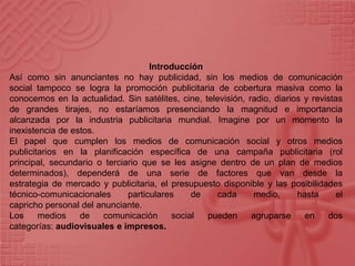 El documento habla sobre los medios de comunicación social y su papel en la publicidad. Describe las categorías de medios audiovisuales e impresos, detallando las ventajas y desventajas de la televisión, el cine, la radio, la prensa y las revistas como medios publicitarios. También menciona que la constitución venezolana garantiza la recepción y circulación de la información cultural a través de los medios de comunicación.