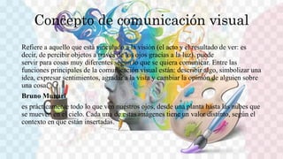 1) La comunicación visual se refiere a la percepción de objetos a través de la vista y puede usarse para describir ideas, expresar sentimientos u opinar. 2) El mensaje visual se compone de información y un soporte visual que incluye textura, forma, estructura y movimiento. 3) La comunicación visual es fundamental en el marketing moderno debido a que las personas procesan la información visualmente de manera más rápida.
