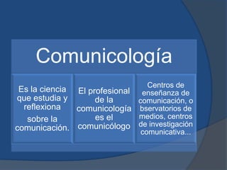 El documento define la comunicología como una ciencia interdisciplinaria que estudia los sistemas de comunicación humana y sus medios. Explica que para enviar un mensaje se debe utilizar un código común entre el emisor y el receptor, como palabras, imágenes o sonidos. También describe la comunicación social como un campo de estudio más complejo que analiza el impacto de la información en la sociedad.