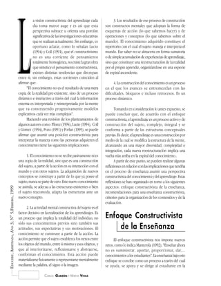 1. El documento reflexiona sobre la aplicabilidad de los principios didácticos del constructivismo en la enseñanza universitaria. 2. Asume el constructivismo como una explicación válida pero no absoluta del aprendizaje, y que aún hay preguntas sin resolver. 3. Presenta los fundamentos teóricos de una propuesta pedagógica basada en una concepción constructivista cognitiva del conocimiento.