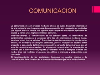 Este documento trata sobre la comunicación y la enseñanza. Define la comunicación como el proceso de transmitir información entre dos entidades mediante signos compartidos. Explica que la comunicación requiere un emisor, mensaje y receptor, y que el receptor decodifica el mensaje. También describe la enseñanza como una actividad que involucra la interacción entre un profesor, alumnos y el objeto de conocimiento, con el profesor transmitiendo conocimiento a los alumnos a través de varios medios.