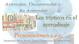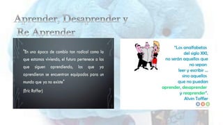 El documento habla sobre la importancia de actualizarse constantemente, desaprender patrones antiguos, clasificar nuevas experiencias y transformar la forma de pensar. También menciona que aprender a desaprender es dejar de hacer lo mismo de manera rutinaria y estar abierto a cambiar paradigmas y probar nuevas formas de conectar ideas.