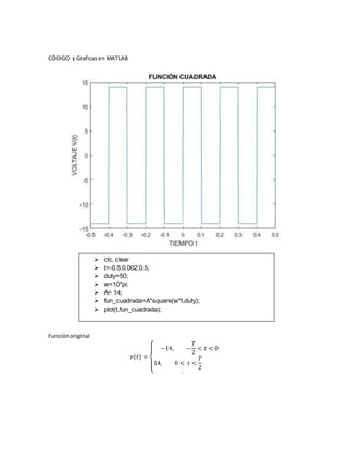 Este documento presenta el código y gráficas de funciones analógicas en MATLAB. Inicialmente se grafica una función cuadrada original. Luego, se grafican una señal senoidal simple, una señal compuesta de la suma de una señal senoidal fundamental y su tercer armónico, y finalmente una señal compuesta de la suma de una señal senoidal fundamental y sus tercer y quinto armónicos. En cada caso se define la función, los parámetros y se grafica la señal resultante.