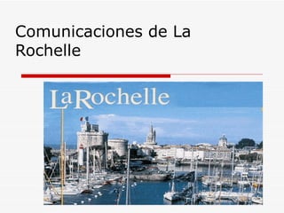 El documento describe las comunicaciones de La Rochelle, Francia. El puerto de La Rochelle es uno de los más importantes de Francia y proporciona conexiones internacionales para el comercio de importación y exportación. La ciudad también tiene conexiones ferroviarias, aeroportuarias y de autobús a otras ciudades francesas e internacionales.
