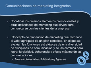 Las comunicaciones de marketing integradas coordinan los diversos elementos promocionales y actividades de marketing para comunicarse con los clientes de manera clara, coherente y efectiva. La integración considera el valor agregado de un plan completo que evalúa las funciones estratégicas de disciplinas como la publicidad, marketing directo, relaciones públicas, ventas personales y promoción de ventas.