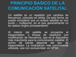 El documento describe los principios básicos de la comunicación satelital. Un satélite actúa como un repetidor que recibe señales de radiofrecuencia, las amplifica y las retransmite a la Tierra. Un sistema satelital consiste en un segmento espacial con satélites en órbita y un segmento terrenal con estaciones que envían y reciben señales. Los satélites contienen transpondedores que cambian la frecuencia de las señales para evitar interferencias.