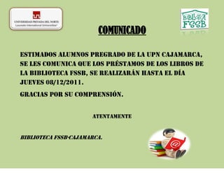 El comunicado informa a los estudiantes pregrado de la UPN Cajamarca que los préstamos de libros de la Biblioteca FSSB se realizarán hasta el jueves 08/12/2011.
