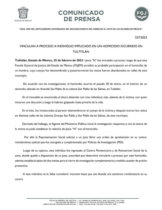 Un hombre fue vinculado a proceso por su probable participación en el homicidio de otra persona en Tultitlán, Estado de México. La víctima fue golpeada hasta morir durante una discusión en un domicilio, y luego su cuerpo fue desmembrado y abandonado en calles cercanas. La investigación de la Fiscalía pudo establecer la relación del detenido con el crimen, por lo que fue detenido y vinculado a proceso con prisión preventiva mientras continúa la investigación del caso.