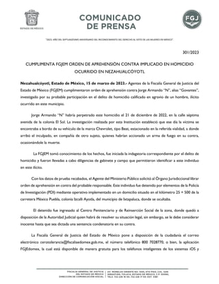 La Fiscalía General de Justicia del Estado de México cumplimentó una orden de aprehensión contra Jorge Armando "N", sospechoso de participar en el homicidio de un hombre en Nezahualcóyotl en diciembre de 2022. La investigación encontró que la víctima fue baleada cuando estaba en su automóvil. Jorge Armando "N" fue detenido en Ixtapaluca y enviado a la cárcel, a la espera de que un juez decida su situación legal.