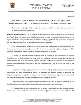 La Fiscalía General de Justicia del Estado de México cumplimentó una orden de aprehensión contra tres sujetos por su probable participación en el robo de un tractocamión con maquinaria de construcción. La maquinaria robada fue hallada y recuperada en un predio de Soyaniquilpan. Los tres sujetos fueron ingresados al Centro Penitenciario de Jilotepec a disposición de un juez, mientras son considerados inocentes hasta que se dicte sentencia en su contra.