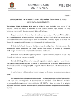 Un hombre identificado como Ricardo "N" fue vinculado a proceso por el delito de feminicidio después de que aparentemente asesinó a su pareja sentimental en Chicoloapan, Estado de México. Un juez determinó iniciar un proceso legal en su contra y fijó un plazo de dos meses para la investigación y prisión preventiva. Según los reportes, Ricardo "N" golpeó y asfixió a su pareja durante una discusión delante de sus dos hijas menores de edad, luego huyó y dejó a las niñas solas