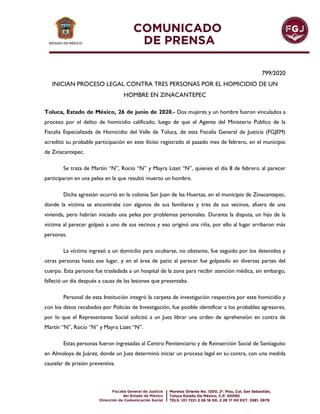Tres personas, dos mujeres y un hombre, fueron vinculadas a proceso por el delito de homicidio calificado luego de que la fiscalía pudiera acreditar su probable participación en el homicidio de un hombre en Zinacantepec en febrero. La víctima se encontraba afuera de una vivienda cuando inició una pelea con vecinos que degeneró en una riña más grande. La víctima fue golpeada en diversas partes del cuerpo por los detenidos y otras personas hasta fallecer al día siguiente. Los tres detenidos fueron ing
