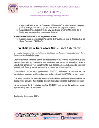 El documento conmemora el Día Internacional de la Mujer Trabajadora y destaca el impacto de la pandemia en la vida de las mujeres trabajadoras, profundizando la desigualdad de género y la carga de los cuidados. Demanda al gobierno garantizar los derechos humanos de las mujeres, priorizar la vacunación de la población económicamente activa, y garantizar el salario mínimo. También demanda al Congreso aprobar legislación a favor de las mujeres y ratificar el Convenio 189 de la OIT, e insta al IGSS