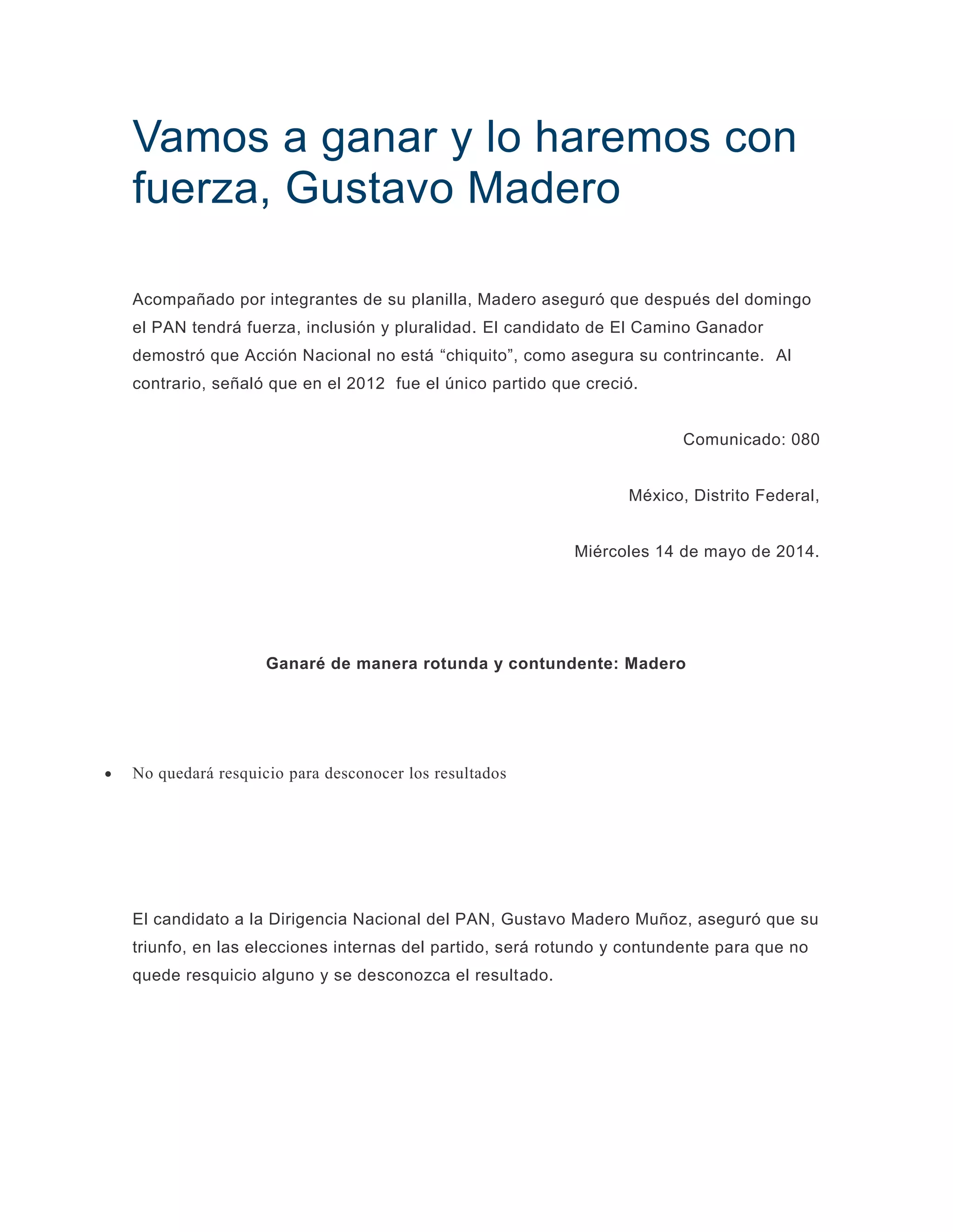 Gustavo Madero, candidato a la dirigencia nacional del PAN, aseguró que ganará las elecciones internas de forma rotunda y contundente para evitar que se desconozcan los resultados. Madero exhortó a su contrincante a reconocer los resultados a su favor. Madero prometió fortalecer al PAN después de las elecciones internas con más fuerza, inclusión y pluralidad. Aseguró que el PAN no es débil como dice su contrincante y que en 2012 fue el único partido que creció.