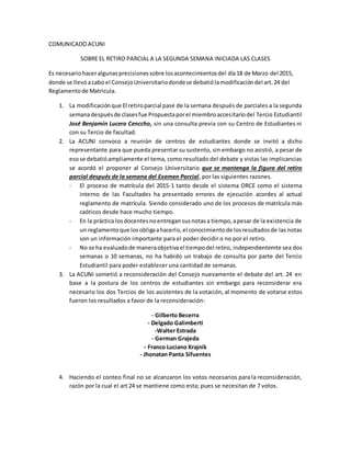 Este documento critica al representante estudiantil José Benjamin Lucero por proponer un cambio al reglamento de matrícula sin consultar a los estudiantes. La ACUNI se opuso a la propuesta de cambiar la fecha límite de retiro parcial de después del examen parcial a la segunda semana de clases. Aunque el Consejo Universitario aprobó inicialmente el cambio, no se lograron los votos necesarios para reconsiderarlo. La ACUNI solicita al Tercio Estudiantil sustentar técnicamente cualquier propuesta de cambio y asegurar