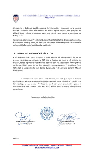 La Confederación Nacional de Funcionarios Municipales de Chile (ASEMUCH) informa sobre el estado de diversas negociaciones y aclaraciones relacionadas con la ley 20.922. Se ha solicitado a la Subdere un informe sobre el concepto de 'plantas' para evitar confusiones, mientras se reanuda la negociación sobre el incentivo al retiro voluntario, con más de 13,000 potenciales beneficiarios identificados. ASEMUCH enfatiza la necesidad de que cualquier proyecto de ley se acuerde con los trabajadores y se espera una respuesta del gobierno en la próxima reunión en agosto.