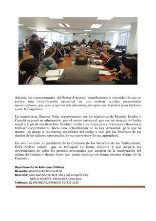 La asambleísta Ximena Peña participó en una comisión que recibió a delegaciones de la Federación de Artesanos del Azuay, Guayas y Pichincha. Los artesanos informaron sobre los aportes de este sector y la necesidad de actualizar las leyes para proteger mejor a los artesanos y sus derechos. La asambleísta Peña expresó su apoyo a los artesanos y la necesidad de trabajar juntos para actualizar la ley de manera que se ajuste a las realidades actuales del sector artesanal.
