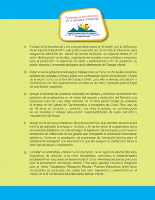 El Comité Regional de la Campaña por la erradicación del Trabajo Infantil en Centroamérica expresa su preocupación por la situación de más de un millón de niños y adolescentes en la región que continúan siendo explotados. El Comité hace un llamado a los gobiernos para que intensifiquen sus esfuerzos para implementar plenamente la Hoja de Ruta para la Erradicación del Trabajo Infantil de 2010, incluyendo ampliar programas educativos y de protección para niños, y trabajar con organizaciones de la sociedad civil para