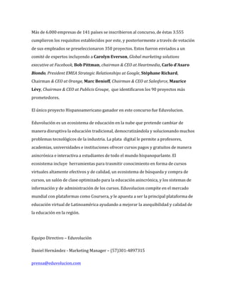 La multinacional de comunicación Publicis Groupe seleccionó 90 startups ganadoras de su proyecto de inversión "Publicis90" para celebrar su 90 aniversario, entre más de 3500 postulantes de 141 países. La única empresa hispanoamericana ganadora fue la colombiana Eduvolución, un ecosistema de educación en la nube que busca democratizar y mejorar la educación en Latinoamérica a través de cursos virtuales de calidad accesibles para estudiantes. Publicis Groupe apoyará financieramente y con mentorías a las 90 startups