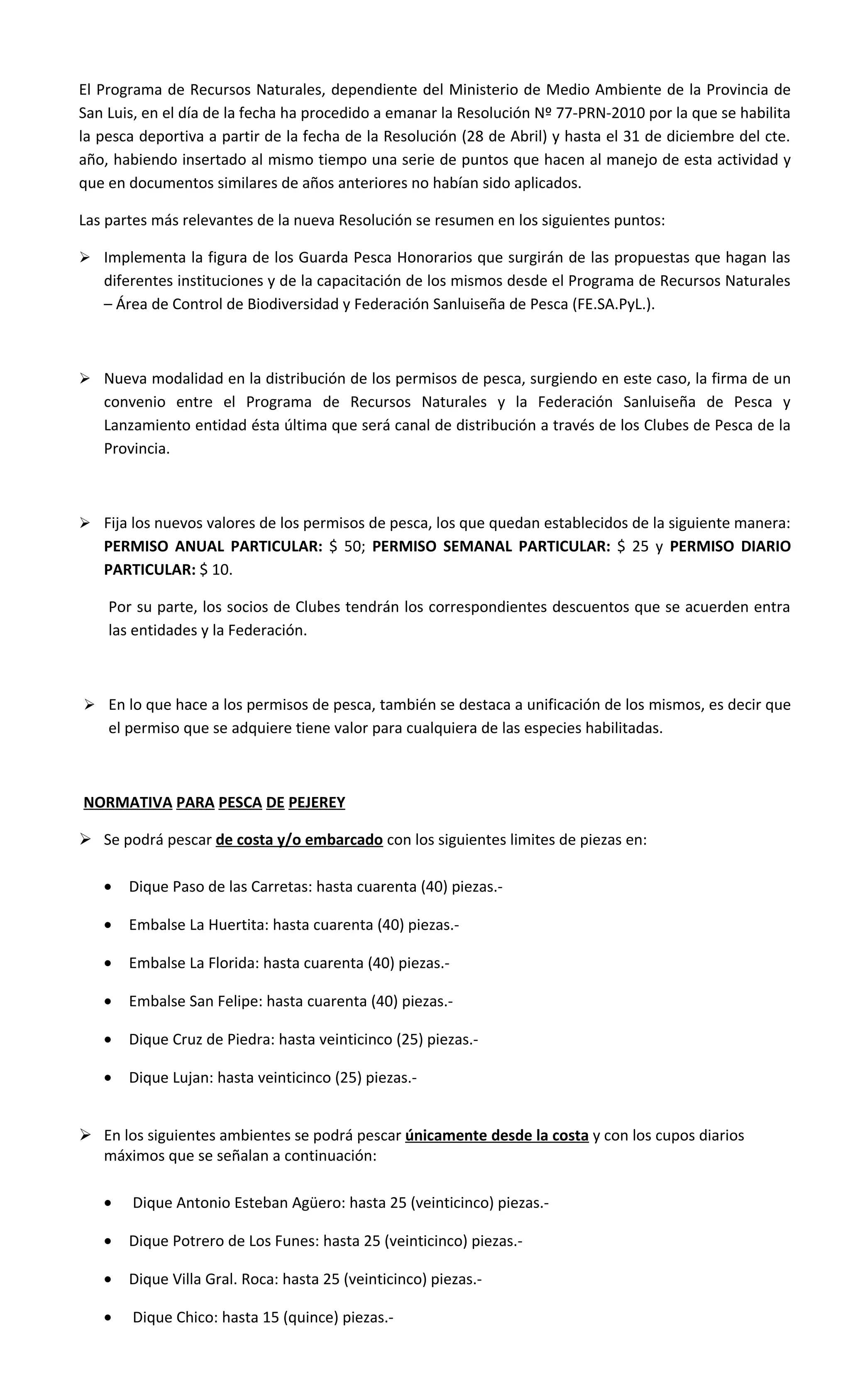 La Resolución 77-PRN-2010 del Ministerio de Medio Ambiente de San Luis regula la pesca deportiva entre el 28 de abril y el 31 de diciembre de 2010. Introduce Guarda Pesca Honorarios, un convenio con la Federación de Pesca para distribuir permisos, y nuevos valores para permisos. Establece límites de captura para pejerrey dependiendo del ambiente, y veda la pesca nocturna embarcada. Regula también la pesca de trucha entre abril-mayo y noviembre-diciembre, con á