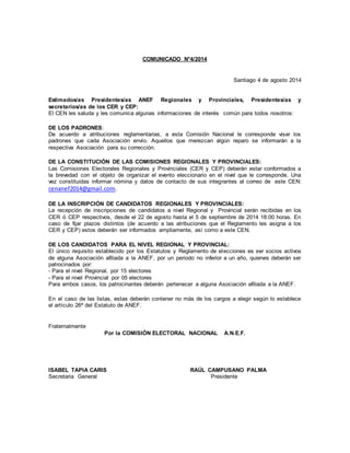 El comunicado informa sobre: 1) la revisión de los padrones electorales por parte de la Comisión Nacional y las correcciones que se solicitarán; 2) la necesidad de que las Comisiones Electorales Regionales y Provinciales se constituyan pronto para organizar las elecciones a nivel regional y provincial; 3) las fechas de inscripción de candidatos para los niveles regional y provincial, del 22 de agosto al 5 de septiembre.