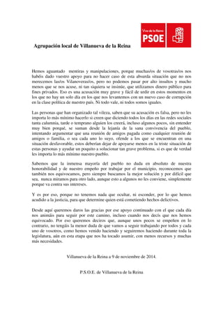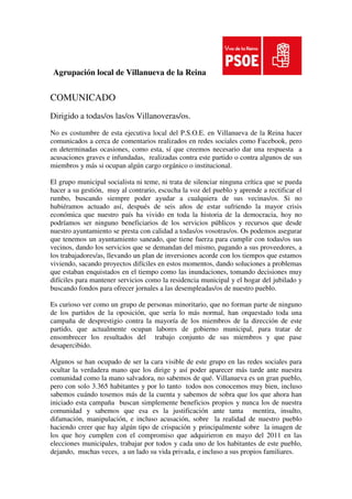 Este comunicado del PSOE de Villanueva de la Reina responde a acusaciones infundadas realizadas contra el partido y sus miembros en cargos. El grupo municipal socialista niega las acusaciones y afirma que ha gestionado el ayuntamiento de forma responsable durante la crisis, manteniendo servicios y empleo. El comunicado denuncia que un grupo minoritario sin afiliación política ha iniciado una campaña de desprestigio contra los dirigentes del PSOE con mentiras, insultos y difamaciones, incluyendo la falsa acus