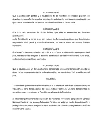 El Consejo Universitario de la Universidad Centroccidental Lisandro Alvarado emitió un pronunciamiento para defender los principios constitucionales y los derechos humanos en Venezuela. Rechazaron la alteración del orden constitucional y la suspensión del referendo revocatorio, instando a la fuerza armada a proteger los derechos del pueblo. Además, ofrecieron los espacios académicos de la universidad para un debate libre sobre la crisis del país, promoviendo el restablecimiento de la democracia.