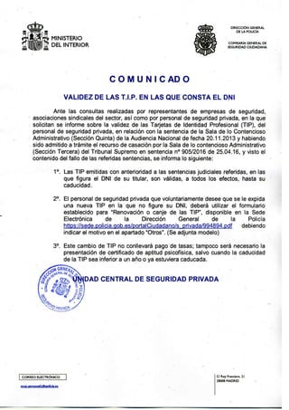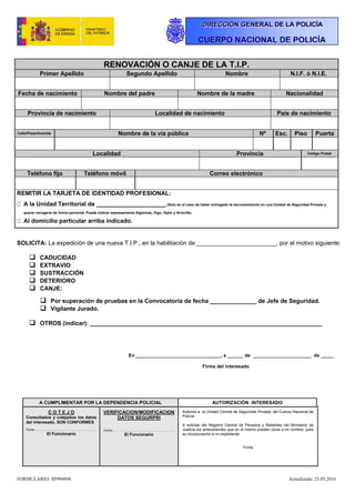 Este documento contiene un formulario para solicitar la renovación o canje de la Tarjeta de Identidad Profesional (TIP) para el personal de seguridad privada en España. El formulario solicita información personal como nombre, fecha de nacimiento y dirección, así como detalles sobre la solicitud como la habilitación requerida y el motivo de la renovación o canje. También incluye instrucciones sobre cómo completar el formulario correctamente y la documentación adicional requerida como una fotografía, informe médico y pruebas de aptitud, dependiendo del tipo