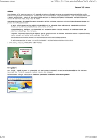 Este documento presenta una propuesta didáctica para enseñar a estudiantes de primer año de secundaria a usar Internet para producir textos orales cortos en una lengua extranjera. Explica cómo los estudiantes pueden usar recursos en línea como videos y blogs para practicar la oralidad, y cómo guardar información de Internet en su computadora para usarla más tarde en sus presentaciones.