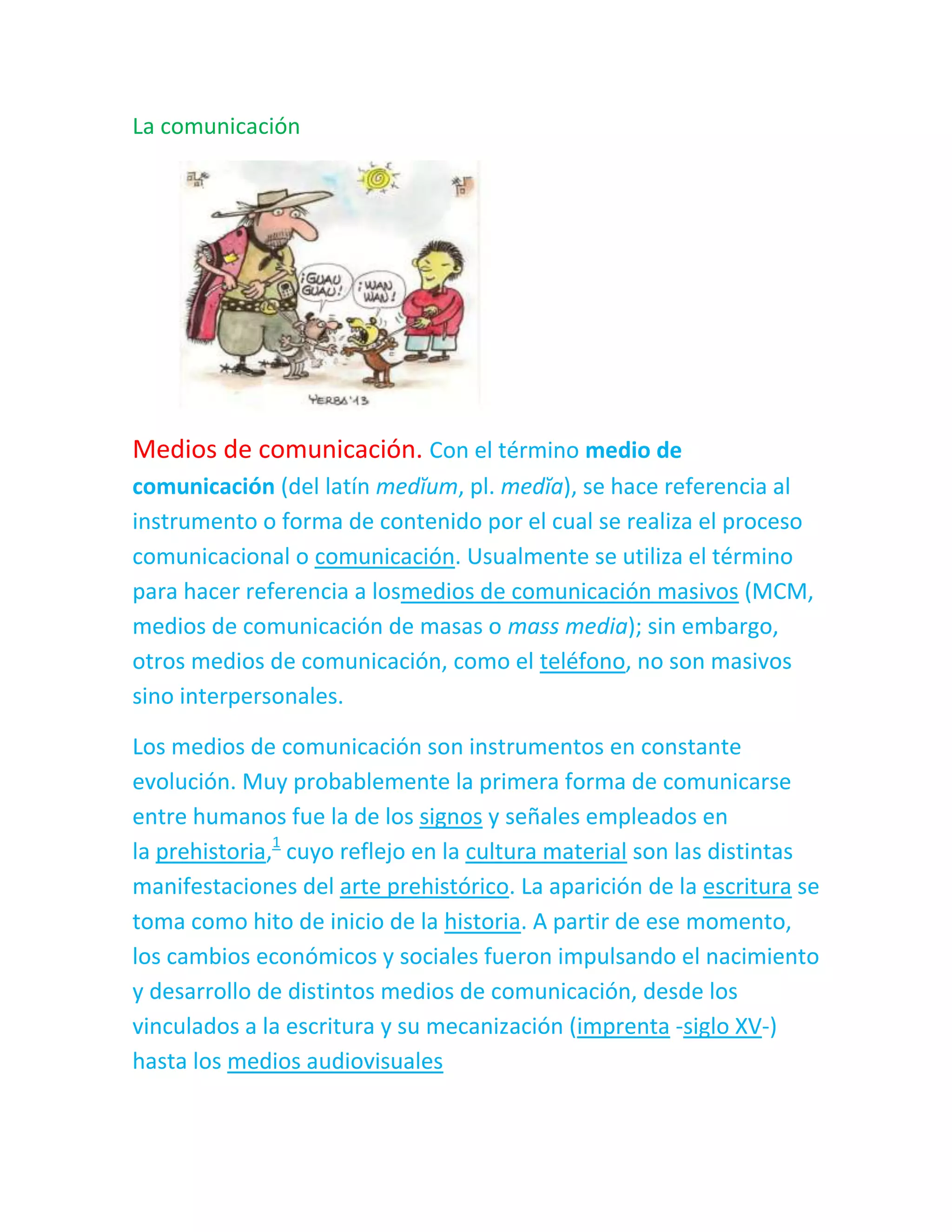 El documento habla sobre los medios de comunicación. Explica que los medios de comunicación son instrumentos que evolucionan constantemente y que se usan para transmitir información entre personas. Menciona que los primeros medios de comunicación probablemente fueron señales y signos prehistóricos, y que luego apareció la escritura, permitiendo el desarrollo de medios como la imprenta y los medios audiovisuales. Finalmente, señala que los medios de comunicación masivos son aquellos dirigidos a grandes audiencias, a diferencia de otros como
