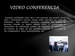 El documento define y describe brevemente cinco tipos de comunicación y medios digitales: videoconferencia que permite reuniones virtuales entre personas separadas geográficamente; chat para comunicación escrita en tiempo real; foros para conversaciones en línea sobre temas comunes; correo electrónico para enviar y recibir mensajes y archivos digitales; y blogs como formato para publicar contenido personal en la web.